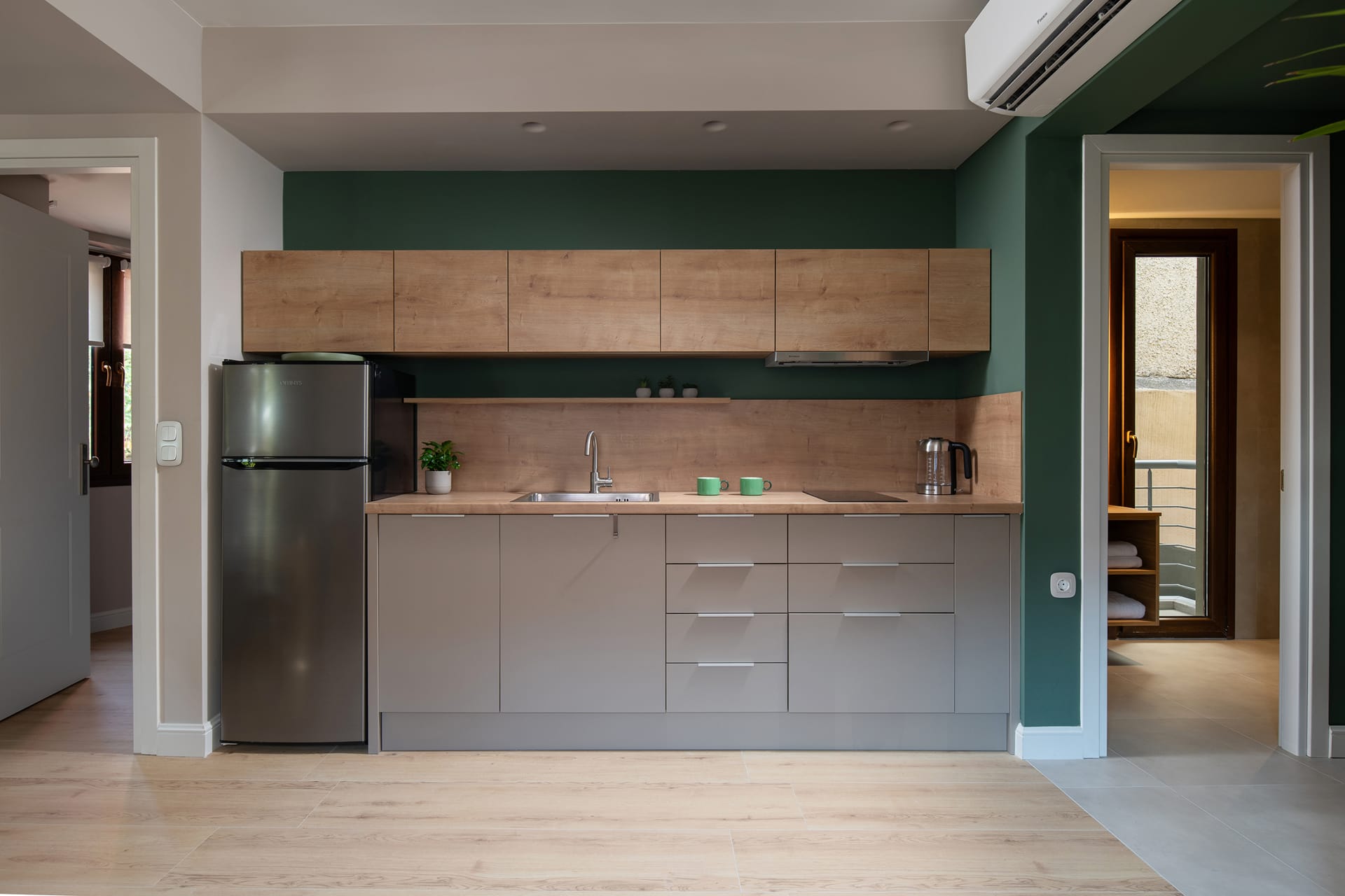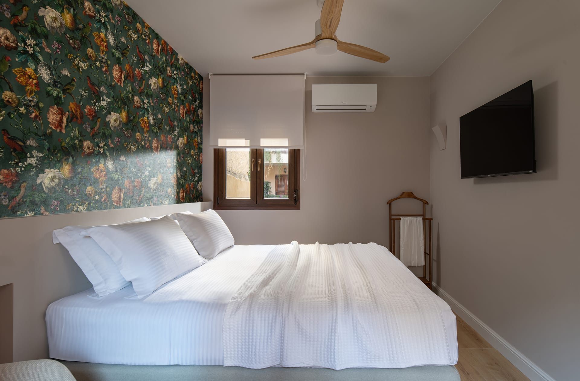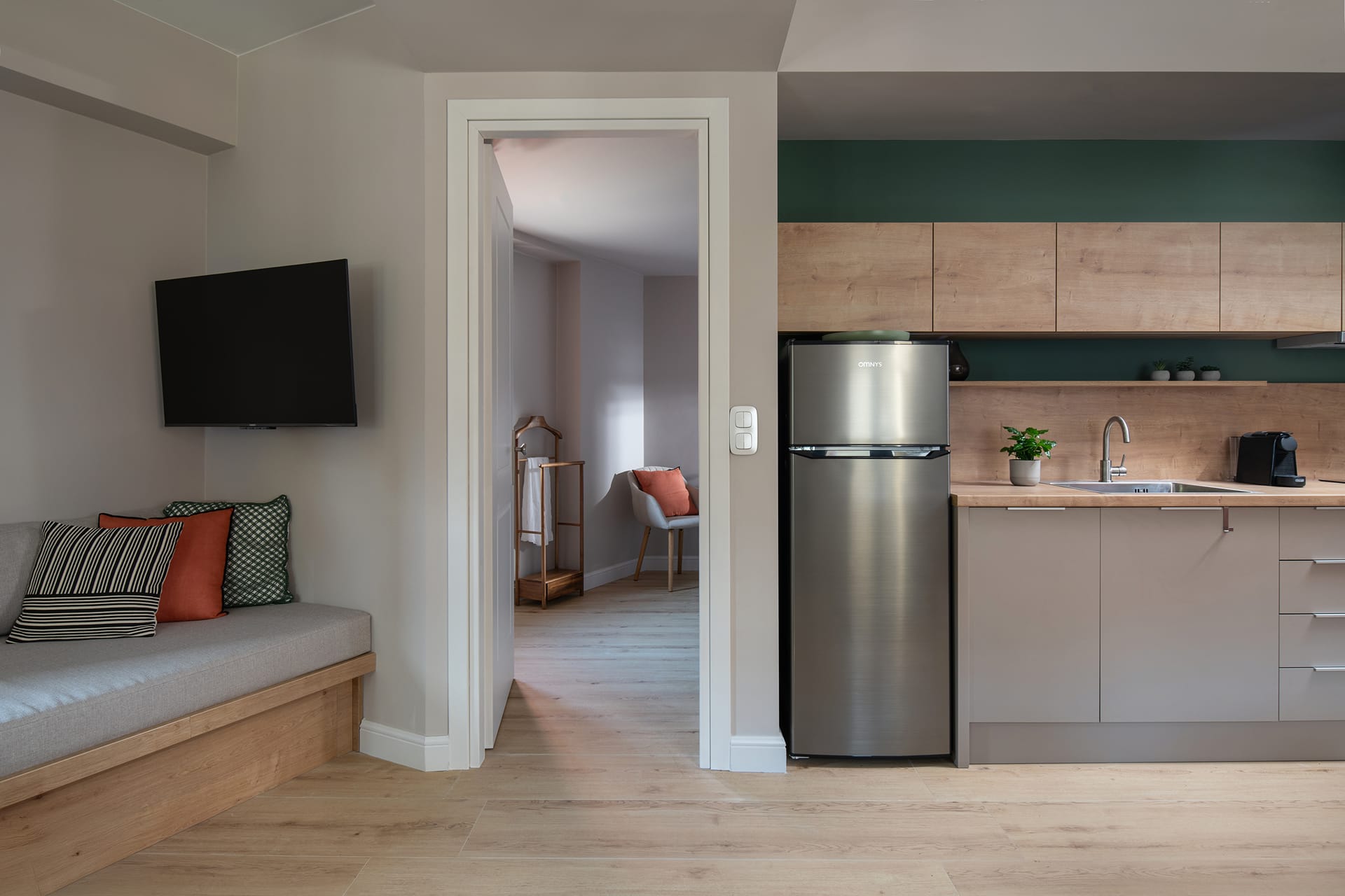 The first floor is filled with natural light from numerous windows and offers a lovely view of the cobbled streets and tiled rooftops of the Upper Town. The living room forms the characteristic “hayati” – an architectural feature of historic residences. The interior blends subtle aesthetics with functionality: it features a comfortable living area, a separate bedroom, a fully equipped kitchen, and a modern bathroom. It is ideal for couples, small families, or travelers seeking an authentic Thessaloniki experience.