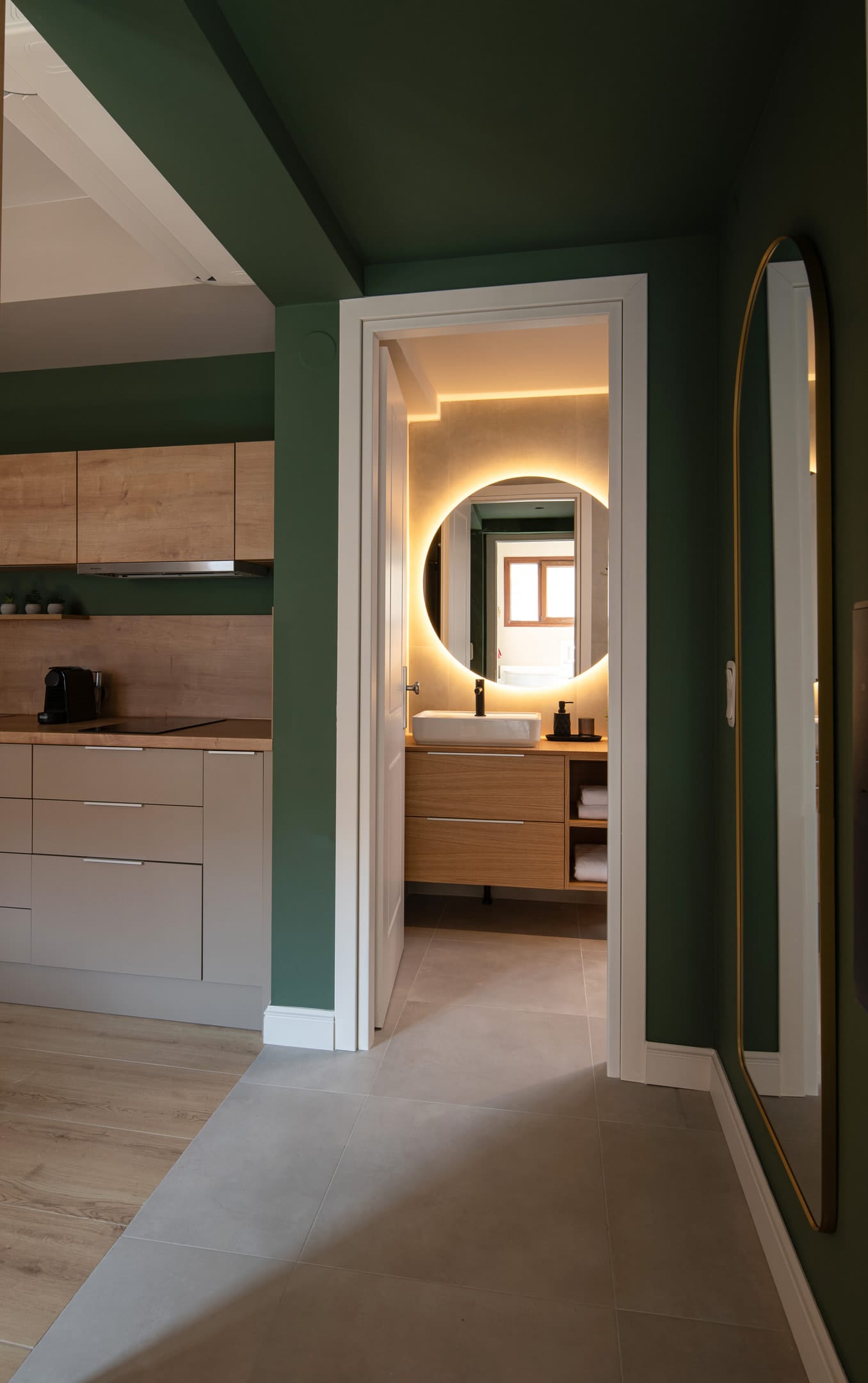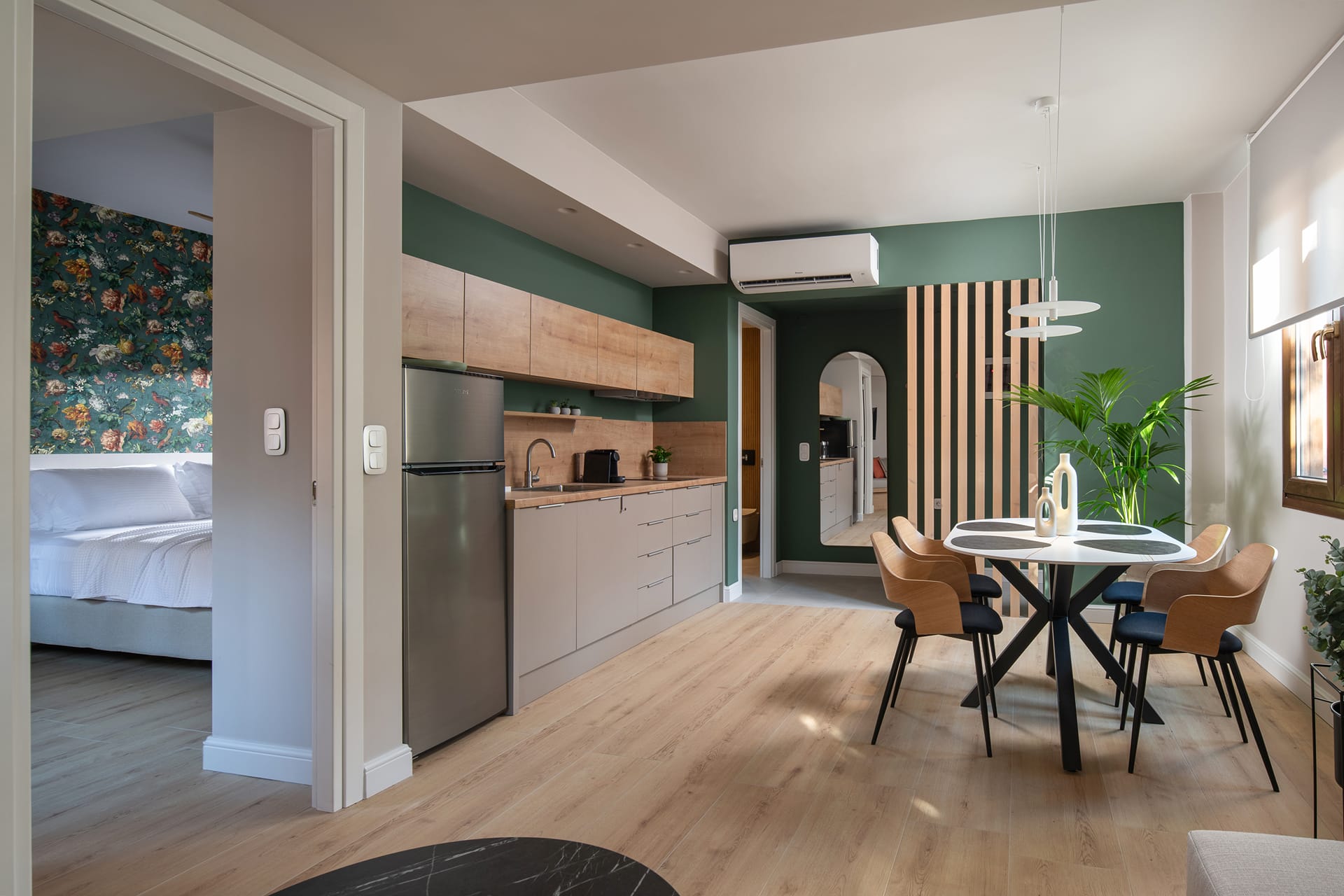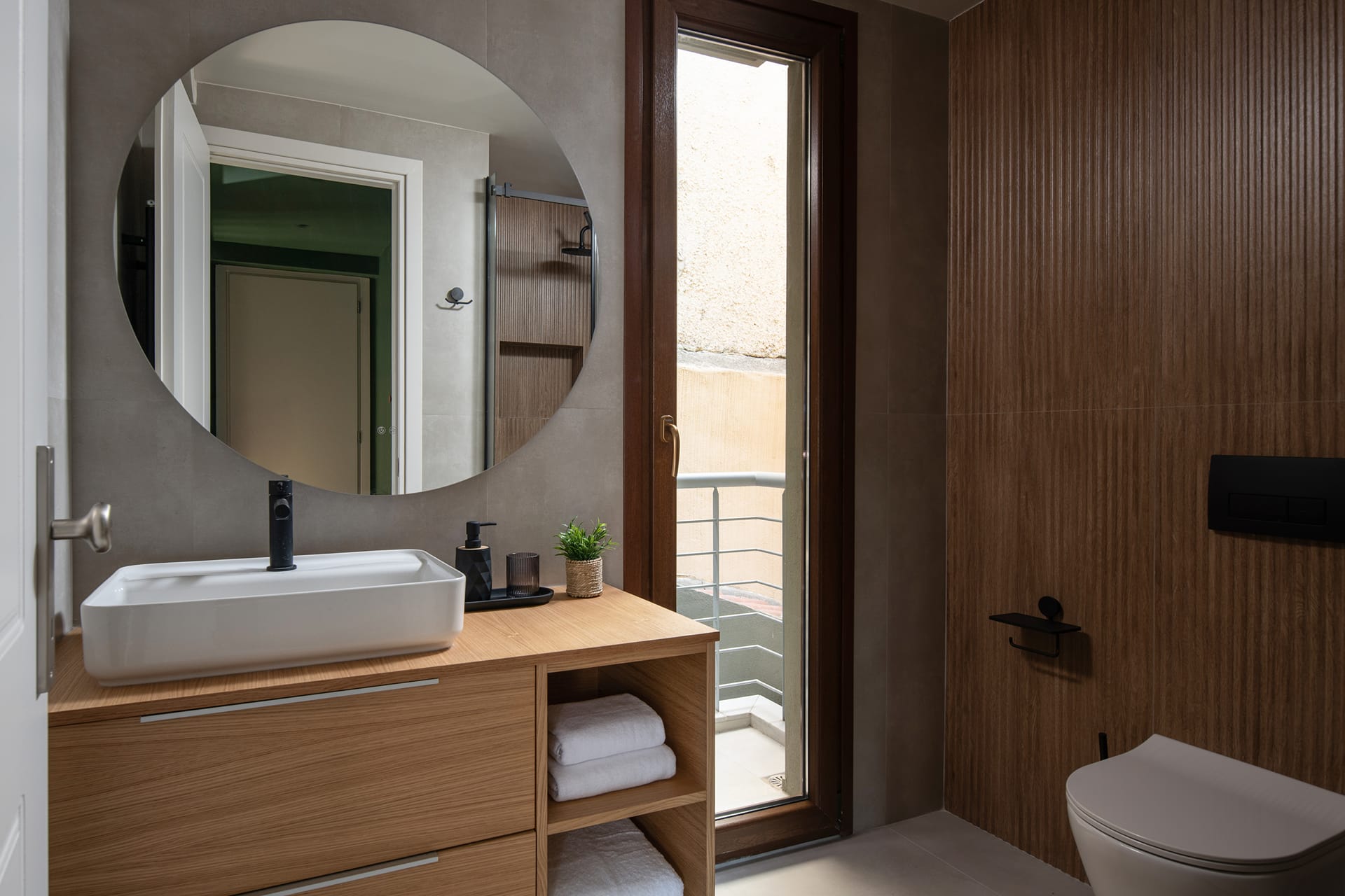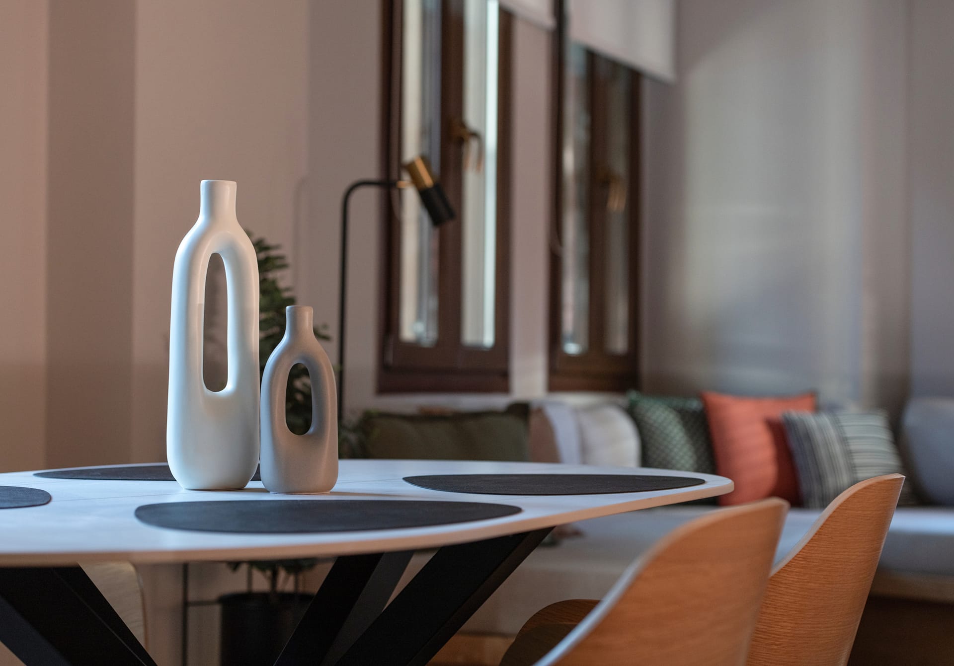 The first floor is filled with natural light from numerous windows and offers a lovely view of the cobbled streets and tiled rooftops of the Upper Town. The living room forms the characteristic “hayati” – an architectural feature of historic residences. The interior blends subtle aesthetics with functionality: it features a comfortable living area, a separate bedroom, a fully equipped kitchen, and a modern bathroom. It is ideal for couples, small families, or travelers seeking an authentic Thessaloniki experience.